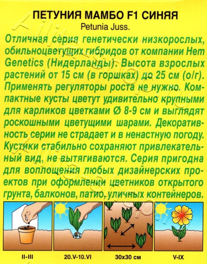 Ценная серия генетически низкорослых, обильно цветущих гибридов. Высота взрослых растений от 15 см (в горшках) до 25 см (о/г). Применять регуляторы роста не нужно. Компактные кусты цветут парадоксально крупными для карликов цветками Ø 8-9 см и выглядят роскошными цветущими шарами. Декоративность серии не страдает в ненастную погоду. Кустики стабильно сохраняют привлекательный вид, не вытягиваются. Серия пригодна для воплощения любых дизайнерских проектов при оформлении цветников открытого грунта, балконов, патио, уличных контейнеров.Посев на рассаду с февраля до апреля. Семена в гранулах! Посев поверхностный, без заделки (семена прорастают на свету!), под стекло или пленку для сохранения постоянной влажности до полных всходов. Гранулы при посеве должны раствориться! Февральским посевам требуется дополнительная подсветка. Всходы появляются на 5-6 день. Пикировка в фазе 1-2-х настоящих листьев. Высадка в грунт закаленной рассады в конце мая.