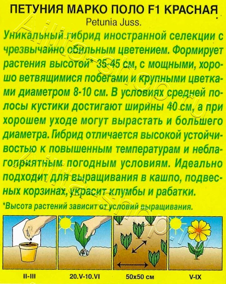 Уникальный гибрид иностранной селекции с чрезвычайно обильным цветением. Формирует растения высотой* 35-45 см с мощными, хорошо ветвящимися побегами и крупными цветками диаметром 8-10 см. В условиях средней полосы кустики достигают ширины 40 см, а при хорошем уходе могут вырастать и большего диаметра. Гибрид отличается высокой устойчивостью к повышенным температурам и неблагоприятным погодным условиям. Идеально подходит для выращивания в кашпо, подвесных корзинах, украсит клумбы и рабатки.*Высота растений зависит от условий выращивания.