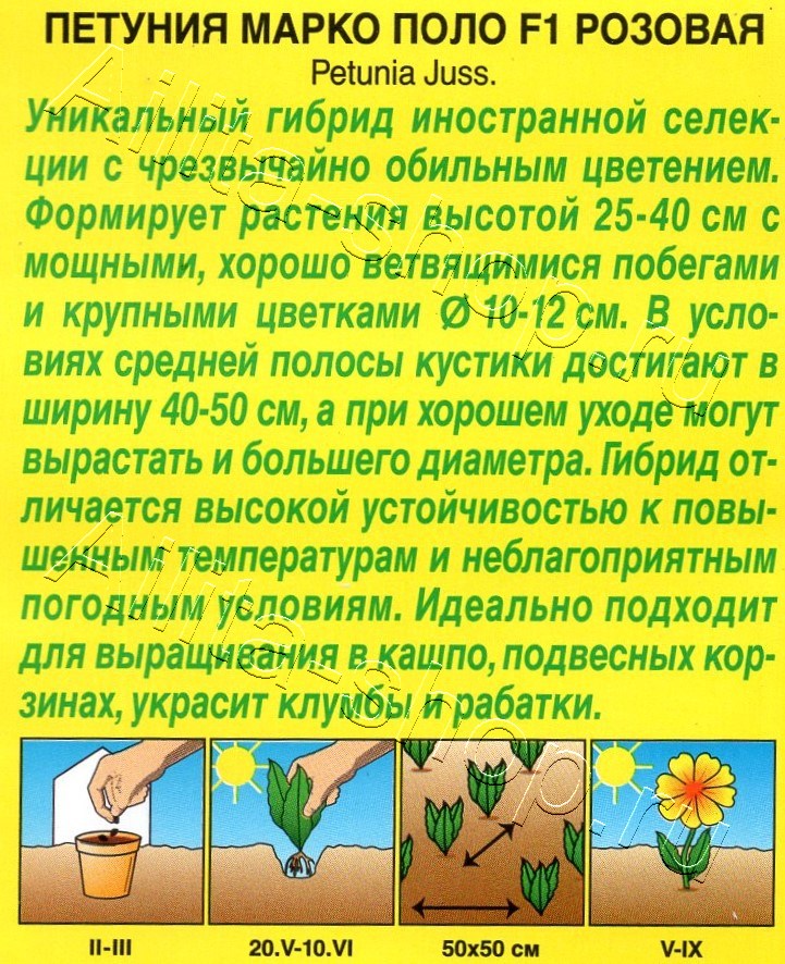 Уникальный гибрид иностранной селекции с чрезвычайно обильным цветением. Формирует растения высотой 25-40 см с мощными, хорошо ветвящимися побегами и крупными цветками 10-12 см. В условиях средней полосы кустики достигают в ширину 40-50 см, а при хорошем уходе могут вырастать и большего диаметра. Гибрид отличается высокой устойчивостью к повышенным температурам и неблагоприятным погодным условиям. Идеально подходит для выращивания в кашпо, подвесных корзинах, украсит клумбы и рабатки.Семена в гранулах! Гранулы располагают на поверхности почвы, не заделывая их, хорошо увлажняют из распылителя. При попадании влаги на гранулу оболочка должна раствориться. Посевы накрывают стеклом для сохранения постоянной влажности до полных всходов. Февральским посевам требуется дополнительная подсветка.