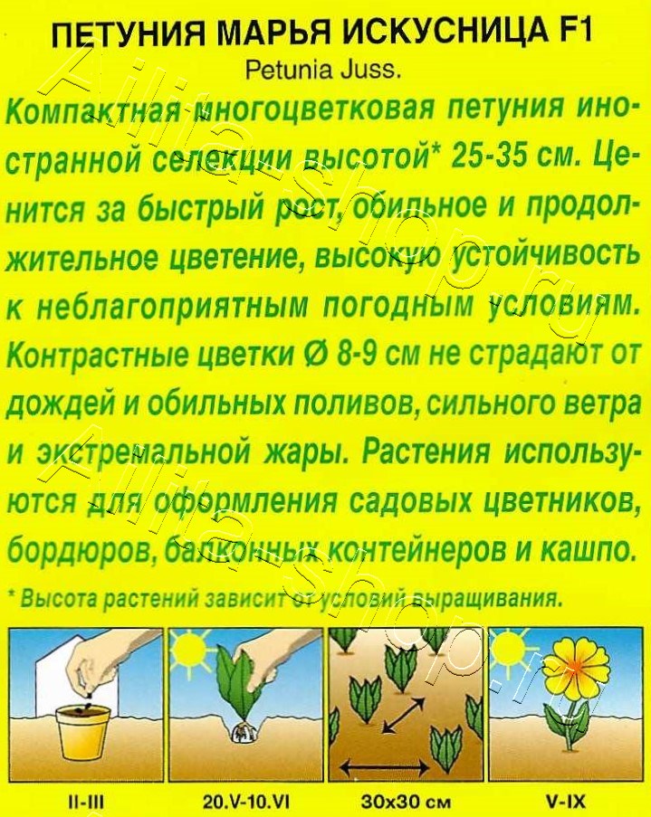 Компактная многоцветковая петуния иностранной селекции высотой* 25-35 см. Ценится за быстрый рост, обильное и продолжительное цветение, высокую устойчивость к неблагоприятным погодным условиям. Контрастные цветки ? 8-9 см не страдают от дождей и обильных поливов, сильного ветра и экстремальной жары. Растения используются для оформления садовых цветников, бордюров, балконных контейнеров и кашпо.* Высота растений зависит от условий выращивания.
