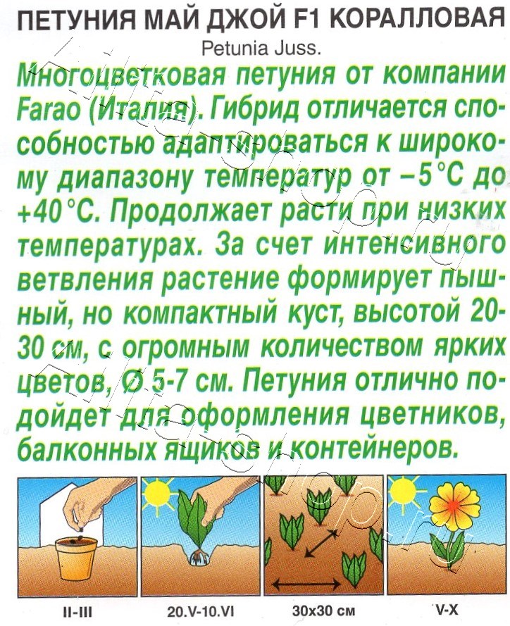 Многоцветковая петуния от компании Farao (Италия). Гибрид отличается способностью адаптироваться к широкому диапазону температур от – 5 °С до +40 °С. Продолжает расти при низких температурах. За счет интенсивного ветвления растение формирует пышный, но компактный куст, высотой 20-30 см, с огромным количеством ярких цветов, 5-7 см. Петуния отлично подойдет для оформления цветников, балконных ящиков и контейнеров.Семена в гранулах! Гранулы располагают на поверхности почвы, не заделывая их, хорошо увлажняют из распылителя. При попадании влаги на гранулу оболочка должна раствориться. Посевы накрывают стеклом для сохранения постоянной влажности до полных всходов. Февральским посевам требуется дополнительная подсветка.