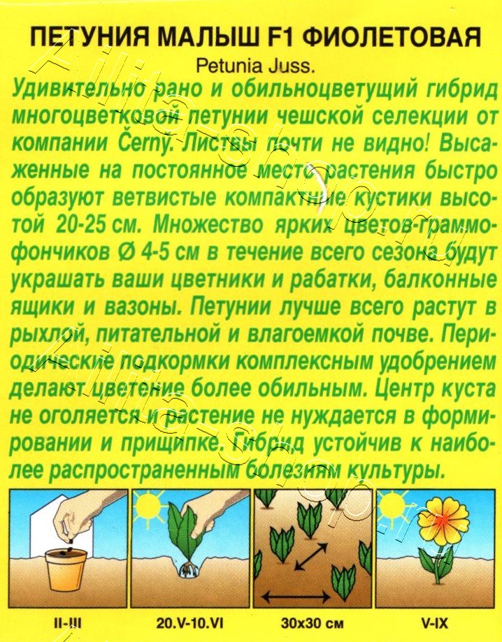 Удивительно рано и обильно цветущий гибрид петунии чешской селекции. Листвы почти не видно! Высаженные на постоянное место растения быстро образуют ветвистые компактные кустики "Ø" 25-30 см. Множество ярких цветов-граммофончиков "Ø" 4-5 см в течениевсего сезона будут украшать ваши цветники и рабатки, балконные ящики и вазоны. Петунии лучше всего растут в рыхлой, питательной и влагоемкой почве. Периодические подкормки комплексным удобрением делают цветение более обильным. Центр куста не оголяется и растение не нуждается в формировании и прищипке. Гибрид устойчив к наиболее распространенным болезням культуры.