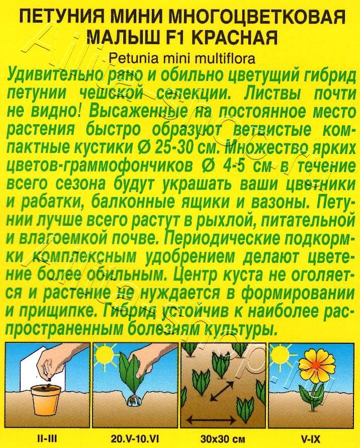 Селекция фирмы " Cerny " (Чехия)Удивительно рано и обильно цветущий гибрид петунии чешской селекции. Листвы почти не видно! Высаженные на постоянное место растения быстро образуют ветвистые компактные кустики 25-30 см. Множество ярких цветов-граммофончиков диаметром 4-5 см в течение всего сезона будут украшать ваши цветники и рабатки, балконные ящики и вазоны. Петунии лучше всего растут в рыхлой, питательной и влагоемкой почве. Периодические подкормки комплексным удобрением делают цветение более обильным. Центр куста не оголяется и растение не нуждается в формировании и прищипке. Гибрид устойчив к наиболее распространенным болезням культуры.