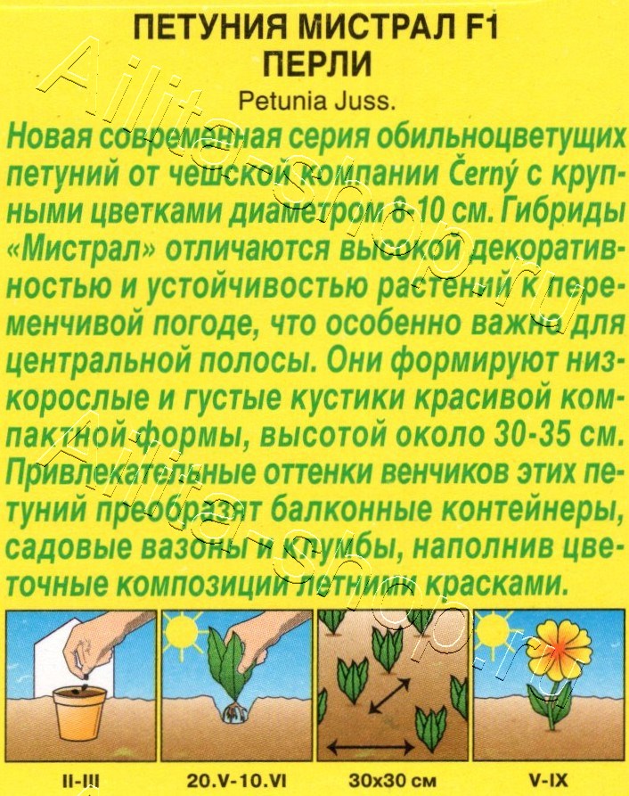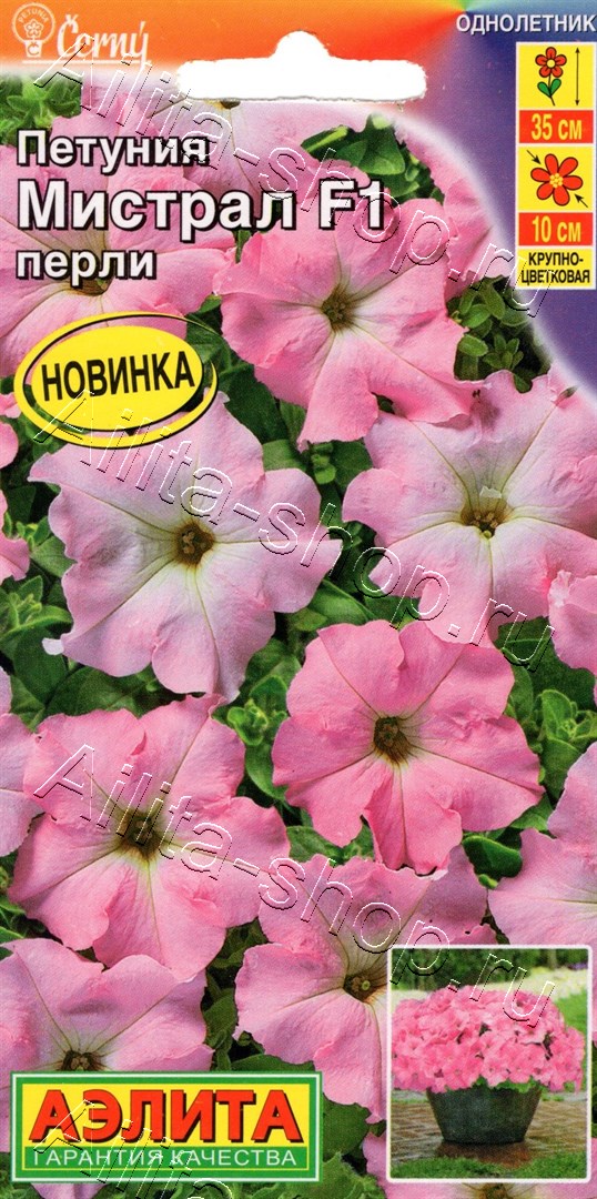 Новая современная серия обильноцветущих петуний от чешской компании Černý c крупными цветками диаметром 8-10 см. Гибриды «Мистрал» отличаются высокой декоративностью и устойчивостью растений к переменчивой погоде, что особенно важно для центральной полосы. Они формируют низкорослые и густые кустики красивой компактной формы, высотой около 30-35 см. Привлекательные оттенки венчиков этих петуний преобразят балконные контейнеры, садовые вазоны и клумбы, наполнив цветочные композиции летними красками.Семена в гранулах! Гранулы располагают на поверхности почвы, не заделывая их, хорошо увлажняют из распылителя. При попадании влаги на гранулу оболочка должна раствориться. Посевы накрывают стеклом для сохранения постоянной влажности до полных всходов. Февральским посевам требуется дополнительная подсветка.