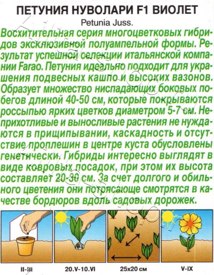 Многоцветковый гибрид редкой полуампельной формы. Восхитительная серия многоцветковых гибридов эксклюзивной полуампельной формы. Результат успешной селекции итальянской компании Farao. Петуния идеально подходит для украшения подвесных кашпо и высоких вазонов. Образует множество ниспадающих боковых побегов длиной 40-50 см, которые покрываются россыпью ярких цветков диаметром 5-7 см. Не прихотливые и выносливые растения не нуждаются в прищипывании, каскадность и отсутствие проплешин в центре куста обусловлены генетически. Гибриды интересно выглядят в виде ковровых посадок, при этом их высота составляет 20-30 см. За счет долгого и обильного цветения они потрясающе смотрятся в качестве бордюров вдоль садовых дорожек.Семена в гранулах! Гранулы располагают на поверхности почвы, не заделывая их, хорошо увлажняют из распылителя. При попадании влаги на гранулу оболочка должна раствориться. Посевы накрывают стеклом для сохранения постоянной влажности до полных всходов. Февральским посевам требуется подсветка.