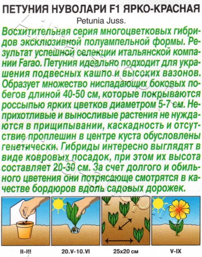 Многоцветковый гибрид редкой полуампельной формы. Восхитительная серия многоцветковых гибридов эксклюзивной полуампельной формы. Результат успешной селекции итальянской компании Farao. Петуния идеально подходит для украшения подвесных кашпо и высоких вазонов. Образует множество ниспадающих боковых побегов длиной 40-50 см, которые покрываются россыпью ярких цветков диаметром 5-7 см. Не прихотливые и выносливые растения не нуждаются в прищипывании, каскадность и отсутствие проплешин в центре куста обусловлены генетически. Гибриды интересно выглядят в виде ковровых посадок, при этом их высота составляет 20-30 см. За счет долгого и обильного цветения они потрясающе смотрятся в качестве бордюров вдоль садовых дорожек.Семена в гранулах! Гранулы располагают на поверхности почвы, не заделывая их, хорошо увлажняют из распылителя. При попадании влаги на гранулу оболочка должна раствориться. Посевы накрывают стеклом для сохранения постоянной влажности до полных всходов. Февральским посевам требуется подсветка.