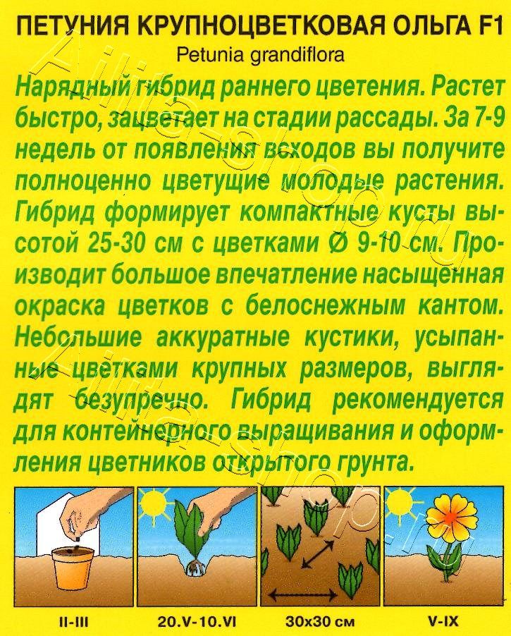 Petunia grandiflora F1Превосходная новинка популярнейшего летника. Ее Высочество ОЛЬГА - крупноцветковая (10 см в диаметре) петуния-пикоти - выделяется бархатом глубокого бургундского оттенка в обрамлении благородного белого. Компактные кустики высотой 30 см, сплошь покрытые эффектными цветками, будут лучшим украшением Вашего цветника. Новинка великолепно подходит для оформления рабаток, бордюров, клумб, садовых контейнеров, балконных ящиков. Гибрид быстрорастущий, отличается богатством цветения, устойчивостью всего растения и отдельного цветка к дождю, ветру, перепадам температур.