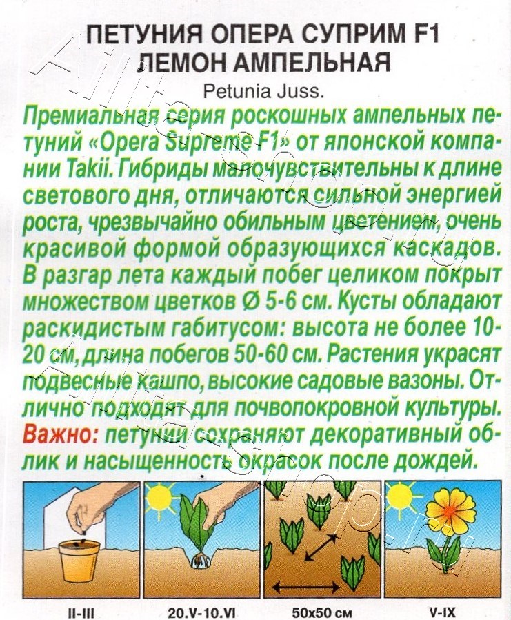 Премиальная серия роскошных ампельных петуний «Opera Supreme F1» от японской компании Takii. Гибриды малочувствительны к длине светового дня, отличаются сильной энергией роста, чрезвычайно обильным цветением, очень красивой формой образующихся каскадов. В разгар лета каждый побег целиком покрыт множеством цветков Ø 5-6 см. Кусты обладают раскидистым габитусом: высота не более 10-20 см, длина побегов 50-60 см. Растения украсят подвесные кашпо, высокие садовые вазоны. Отлично подходят для почвопокровной культуры. Важно: петунии сохраняют декоративный облик и насыщенность окрасок после дождей.