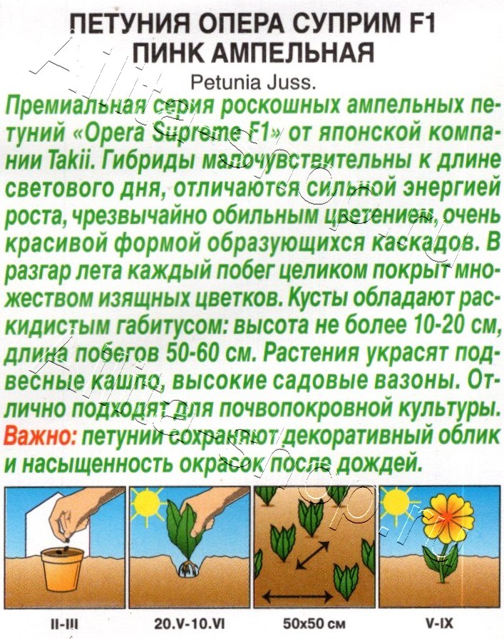 Премиальная серия роскошных ампельных петуний «OperaSupreme F1» от японской компании Takii. Гибриды малочувствительны к длине светового дня, отличаются сильной энергией роста, чрезвычайно обильным цветением, очень красивой формой образующихся каскадов. В разгар лета каждый побег целиком покрыт множеством изящных цветков. Кусты обладают раскидистым габитусом: высота не более 10-20 см, длина побегов 50-60 см. Растения украсят подвесные кашпо, высокие садовые вазоны. Отлично подходят для почвопокровной культуры.Важно: петунии сохраняют декоративный облик и насыщенность окрасок после дождей.
