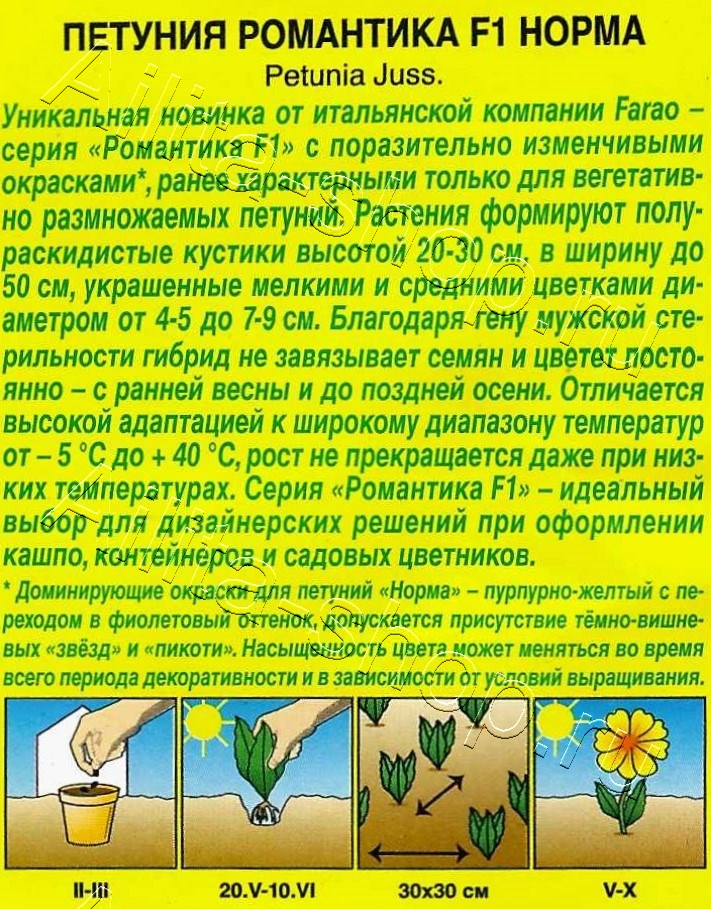 Уникальная новинка от итальянской компании Farao – серия «Романтика F1» с поразительно изменчивыми окрасками*, ранее характерными только для вегетативно размножаемых петуний. Растения формируют полураскидистые кустики высотой 20-30 см, в ширину до 50 см, украшенные мелкими и средними цветками диаметром от 4-5 до 7-9 см. Благодаря гену мужской стерильности гибрид не завязывает семян и цветет постоянно – с ранней весны и до поздней осени. Отличается высокой адаптацией к широкому диапазону температур от – 5 °С до + 40 °С, рост не прекращается даже при низких температурах. Серия «Романтика F1» – идеальный выбор для дизайнерских решений при оформлении кашпо, контейнеров и садовых цветников.* Доминирующие окраски для петуний «Норма» – пурпурно-желтый с переходом в фиолетовый оттенок, допускается присутствие тёмно-вишневых «звёзд» и «пикоти». Насыщенность цвета может меняться во время всего периода декоративности и в зависимости от условий выращивания.