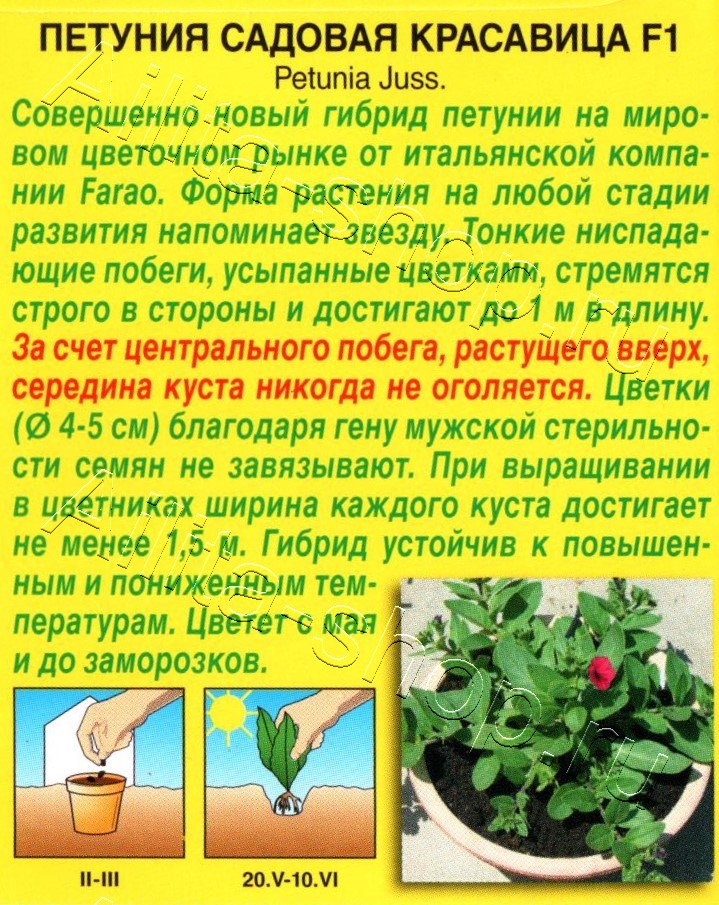Petunia multifloraСовершенно новый гибрид петунии на мировом цветочном рынке. Форма растения на любой стадии развития напоминает звезду. Тонкие, ниспадающие побеги усыпанные цветками стремятся строго в стороны и достигают до 1 м в длину. За счет центрального побега, растущего вверх, середина куста никогда не оголяется. Цветки ( Ø 4-5 см) благодаря гену мужской стерильности семян не завязывают. При выращивании в цветниках ширина каждого куста достигает не менее 1,5 м. Гибрид устойчив к повышенным и пониженным температурам. Цветет с мая по октябрь.