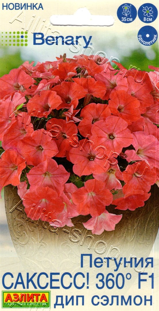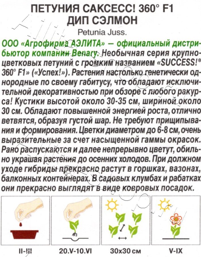 ООО «Агрофирма АЭЛИТА» — официальный дистрибьютор компании Benary.Необычная серия крупноцветковых петуний с громким названием «SUCCESS!® 360° F1» («Успех!»). Растения настолько генетически однородные по своему габитусу, что обладают исключительной декоративностью при обзоре с любого ракурса! Кустики высотой около 30-35 см, шириной около 30 см. Обладают повышенной энергией роста, отлично ветвятся, образуя густой шар. Не требуют прищипывания и формирования. Цветки диаметром до 6-8 см, очень выразительные за счет насыщенной гаммы окрасок. Рано распускаются и далее непрерывно цветут, обильно украшая растения до осенних холодов. При должном уходе гибриды прекрасно растут в горшках, вазонах, балконных контейнерах. В садовых клумбах и рабатках они прекрасно выглядят в виде ковровых посадок.