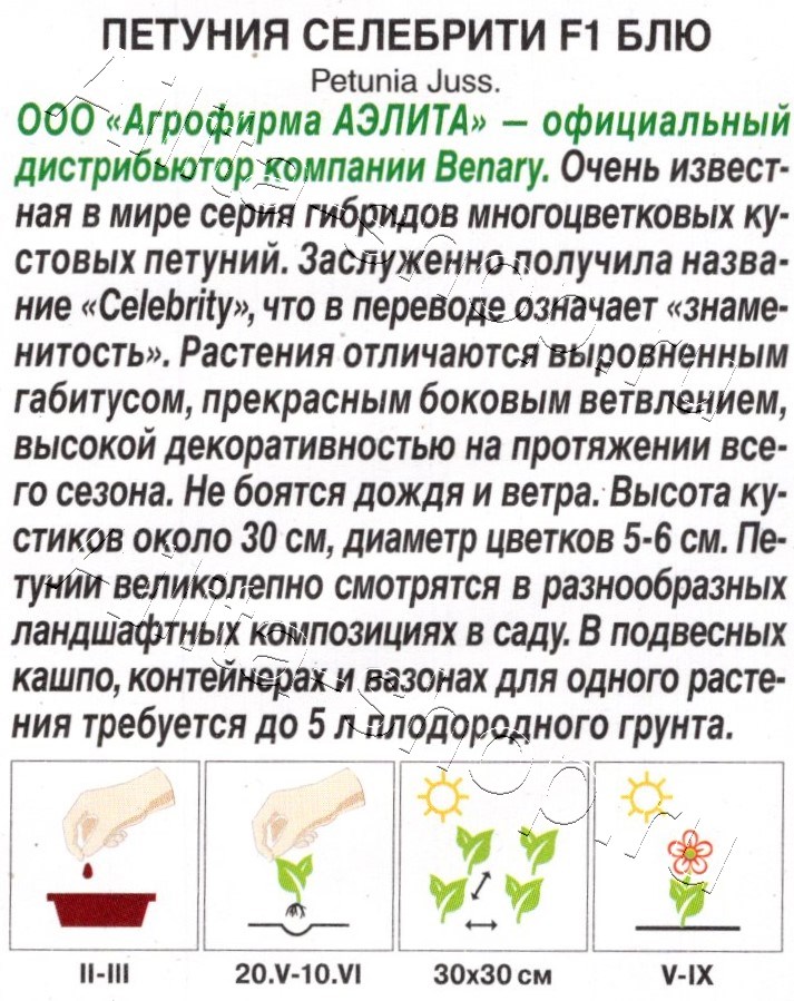 ООО «Агрофирма АЭЛИТА» — официальный дистрибьютор компании Benary.Очень известная в мире серия гибридов многоцветковых кустовых петуний. Заслуженно получила название «Celebrity», что в переводе означает «знаменитость». Растения отличаются выровненным габитусом, прекрасным боковым ветвлением, высокой декоративностью на протяжении всего сезона. Не боятся дождя и ветра. Высота кустиков около 30 см, диаметр цветков 5-6 см. Петунии великолепно смотрятся в разнообразных ландшафтных композициях в саду. В подвесных кашпо, контейнерах и вазонах для одного растения требуется до 5 л плодородного грунта.
