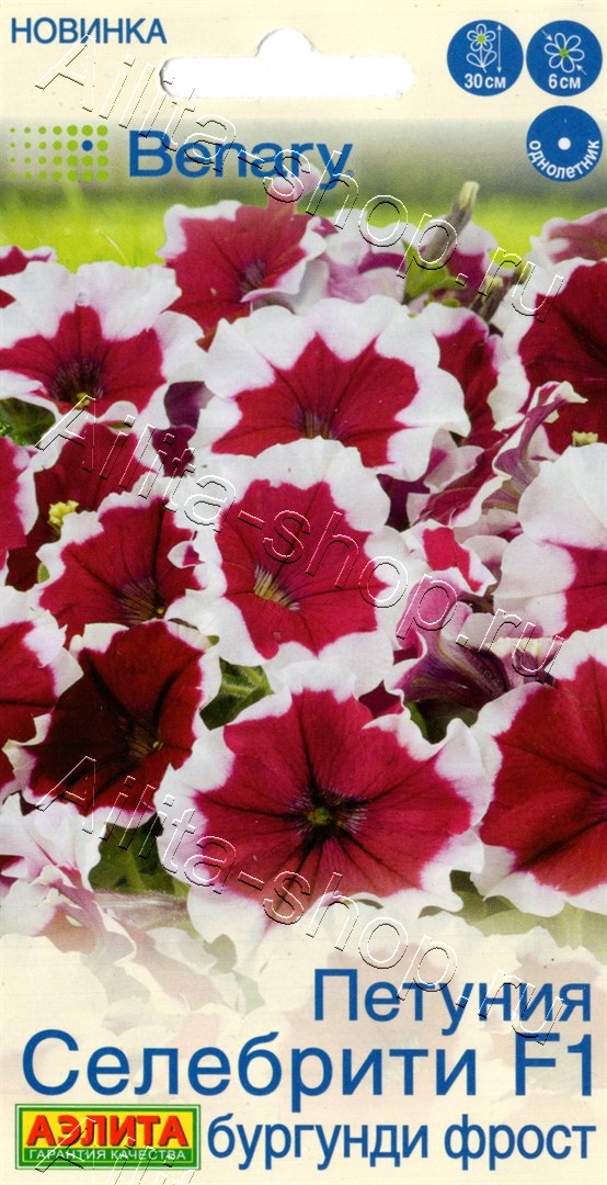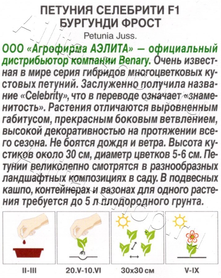 ООО «Агрофирма АЭЛИТА» — официальный дистрибьютор компании Benary.Очень известная в мире серия гибридов многоцветковых кустовых петуний. Заслуженно получила название «Celebrity», что в переводе означает «знаменитость». Растения отличаются выровненным габитусом, прекрасным боковым ветвлением, высокой декоративностью на протяжении всего сезона. Не боятся дождя и ветра. Высота кустиков около 30 см, диаметр цветков 5-6 см. Петунии великолепно смотрятся в разнообразных ландшафтных композициях в саду. В подвесных кашпо, контейнерах и вазонах для одного растения требуется до 5 л плодородного грунта.