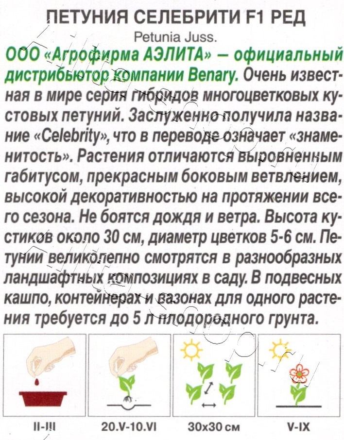 ООО «Агрофирма АЭЛИТА» — официальный дистрибьютор компании Benary.Очень известная в мире серия гибридов многоцветковых кустовых петуний. Заслуженно получила название «Celebrity», что в переводе означает «знаменитость». Растения отличаются выровненным габитусом, прекрасным боковым ветвлением, высокой декоративностью на протяжении всего сезона. Не боятся дождя и ветра. Высота кустиков около 30 см, диаметр цветков 5-6 см. Петунии великолепно смотрятся в разнообразных ландшафтных композициях в саду. В подвесных кашпо, контейнерах и вазонах для одного растения требуется до 5 л плодородного грунта.
