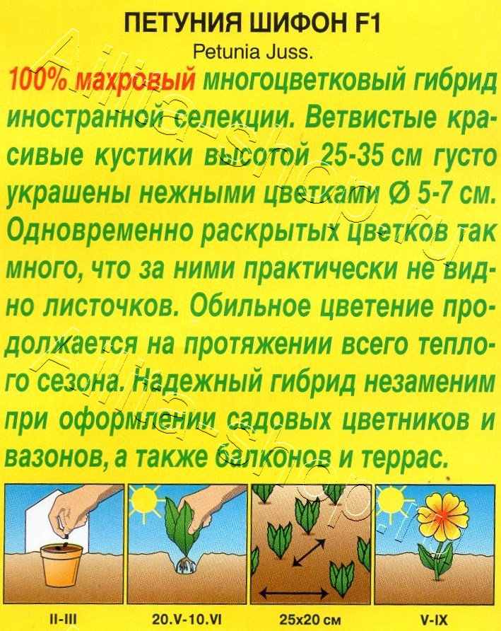 100% махровый многоцветковый гибрид иностранной селекции. Ветвистые красивые кустики высотой 25-35 см густо украшены нежными цветками 5-7 см. Одновременно раскрытых цветков так много, что за ними практически не видно листочков. Обильное цветение продолжается на протяжении всего теплого сезона. Надежный гибрид незаменим при оформлении садовых цветников и вазонов, а также балконов и террас.Семена в гранулах! Гранулы располагают на поверхности почвы, не заделывая их, хорошо увлажняют из распылителя. При попадании влаги на гранулу оболочка должна раствориться. Посевы накрывают стеклом для сохранения постоянной влажности до полных всходов. Февральским посевам требуется дополнительная подсветка.