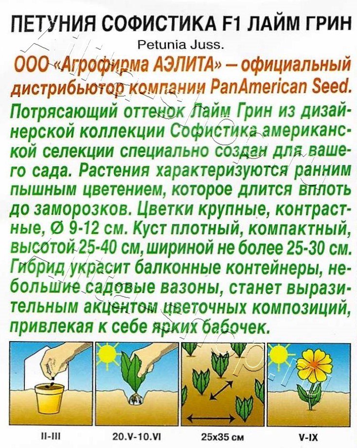Потрясающий оттенок Лайм Грин из дизайнерской коллекции Софистика американской селекции специально создан для вашего сада. Растения характеризуются ранним пышным цветением, которое длится вплоть до заморозков. Цветки крупные, контрастные, ? 9-12 см. Куст плотный, компактный, высотой 25-40 см, шириной не более 25-30 см. Гибрид украсит балконные контейнеры, небольшие садовые вазоны, станет выразительным акцентом цветочных композиций, привлекая к себе ярких бабочек.Семена в гранулах! Гранулы располагают на поверхности почвы, не заделывая их, хорошо увлажняют из распылителя. При попадании влаги на гранулу оболочка должна раствориться. Посевы накрывают стеклом для сохранения постоянной влажности до полных всходов. Февральским посевам требуется дополнительная подсветка.