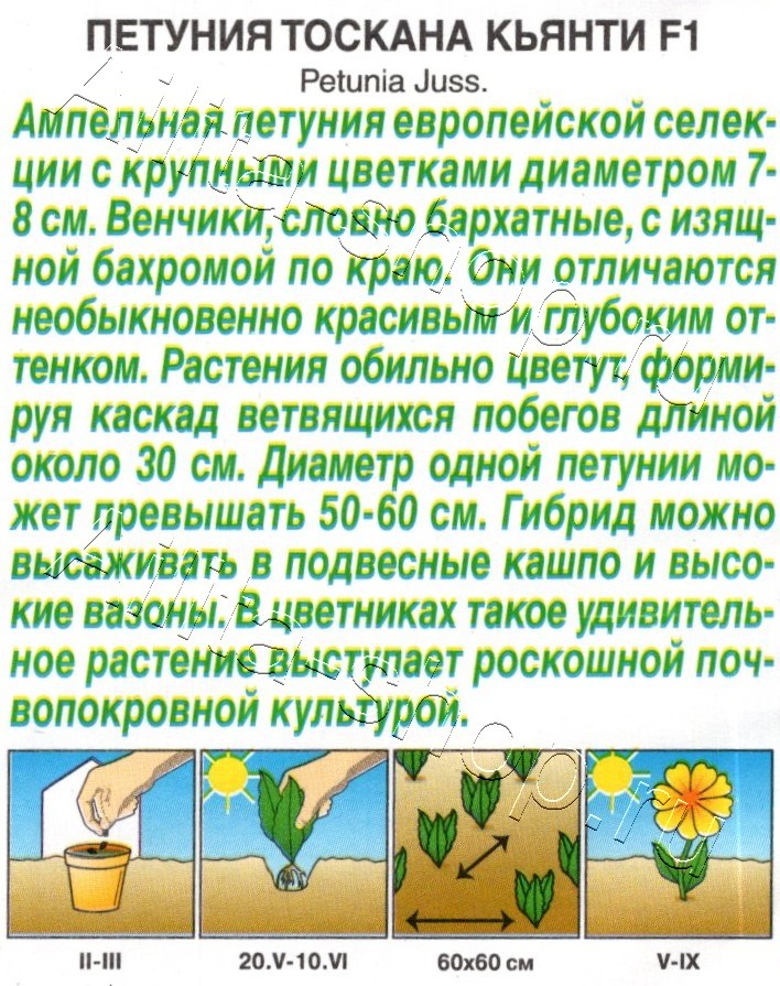 Ампельная петуния европейской селекции с крупными цветками диаметром 7-8 см. Венчики, словно бархатные, с изящной бахромой по краю. Они отличаются необыкновенно красивым и глубоким оттенком. Растения обильно цветут, формируя каскад ветвящихся побегов длиной около 30 см. Диаметр одной петунии может превышать 50-60 см. Гибрид можно высаживать в подвесные кашпо и высокие вазоны. В цветниках такое удивительное растение выступает роскошной почвопокровной культурой.Семена в гранулах! Гранулы располагают на поверхности почвы, не заделывая их, хорошо увлажняют из распылителя. При попадании влаги на гранулу оболочка должна раствориться. Посевы накрывают стеклом для сохранения постоянной влажности до полных всходов. Февральским посевам требуется дополнительная подсветка.