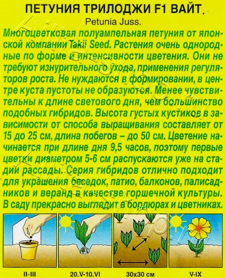 Многоцветковая полуампельная петуния от японской компании Takii Seed. Растения очень однородные по форме и интенсивности цветения. Они не требуют изнурительного ухода, применения регуляторов роста. Не нуждаются в формировании, в центре куста пустоты не образуются. Менее чувствительны к длине светового дня, чем большинство подобных гибридов. Высота густых кустиков в зависимости от способа выращивания составляет от 15 до 25 см, длина побегов – до 50 см. Цветение начинается при длине дня 9,5 часов, поэтому первые цветки диаметром 5-6 см распускаются уже на стадии рассады. Серия гибридов отлично подходит для украшения беседок, патио, балконов, палисадников и веранд в качестве горшечной культуры. В саду прекрасно выглядит в бордюрах и цветниках.Семена в гранулах! Гранулы располагают на поверхности почвы, не заделывая их, хорошо увлажняют из распылителя. При попадании влаги на гранулу оболочка должна раствориться. Посевы накрывают стеклом для сохранения постоянной влажности до полных всход
