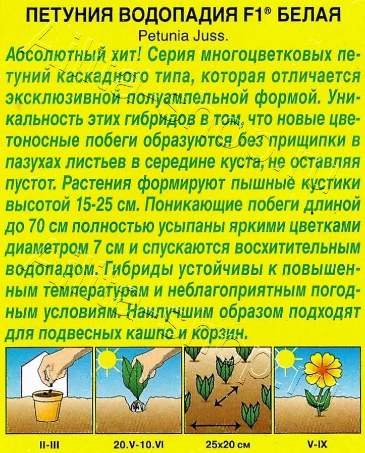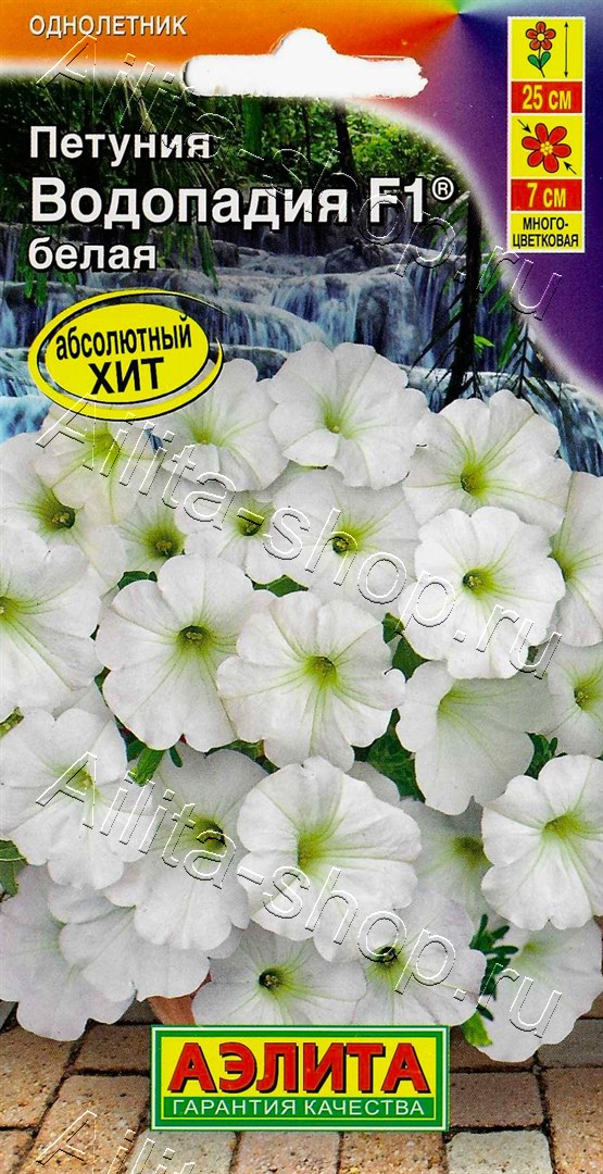 Абсолютный хит! Серия многоцветковых петуний каскадного типа, которая отличается эксклюзивной полуампельной формой. Уникальность этих гибридов в том, что новые цветоносные побеги образуются без прищипки в пазухах листьев в середине куста, не оставляя пустот. Растения формируют пышные кустики высотой 15-25 см. Поникающие побеги длиной до 70 см полностью усыпаны яркими цветками диаметром 7 см и спускаются восхитительным водопадом. Гибриды устойчивы к повышенным температурам и неблагоприятным погодным условиям. Петунии Водопадия F1® наилучшим образом подходят для подвесных кашпо и корзин.Семена в гранулах! Гранулы располагают на поверхности поч вы, не заделывая их, хорошо увлажняют из распылителя. При попадании влаги на гранулу оболочка должна раствориться. Посевы накрывают стеклом для сохранения постоянной влажности до полных всходов. Февральским посевам требуется дополнительная подсветка.