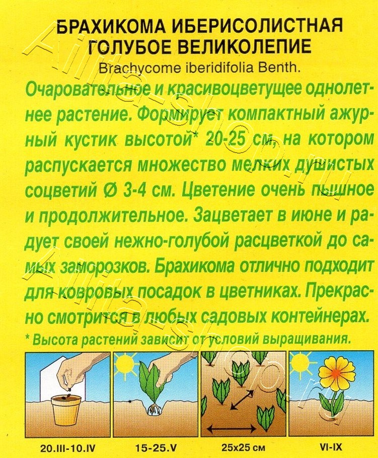 Очаровательное и красивоцветущее однолетнее растение. Формирует компактный ажурный кустик высотой* 20-25 см, на котором распускается множество мелких душистых соцветий Ø 3-4 см. Цветение очень пышное и продолжительное. Зацветает в июне и радует своей нежно-голубой расцветкой до самых заморозков. Брахикома отлично подходит для ковровых посадок в цветниках. Прекрасно смотрится в любых садовых контейнерах.* Высота растений зависит от условий выращивания.