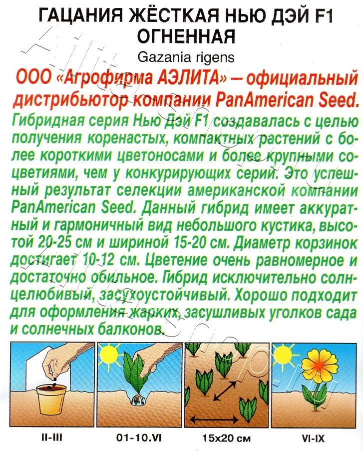 Гибридная серия Нью Дэй F1 создавалась с целью получения коренастых, компактных растений с более короткими цветоносами и более крупными соцветиями, чем у конкурирующих серий. Это успешный результат селекции американской компании PanAmerican Seed. Данный гибрид имеет аккуратный и гармоничный вид небольшого кустика, высотой 20-25 см и шириной 15-20 см. Диаметр корзинок достигает 10-12 см. Цветение очень равномерное и достаточно обильное. Гибрид исключительно солнцелюбивый, засухоустойчивый. Хорошо подходит для оформления жарких, засушливых уголков сада и солнечных балконов.Для увеличения продолжительности цветения осенью гацанию пересаживают в вазоны и заносят в дом. Чтобы сохранить гибрид до следующего сезона, ему нужно обеспечить зимовку в светлом прохладном помещении (+8...+10°С).