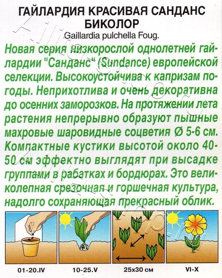 Новая серия низкорослой однолетней гайлардии "Санданс" (Sundance) европейской селекции. Высокоустойчива к капризам по годы. Неприхотлива и очень декоративна до осенних заморозков. На протяжении лета растения непрерывно образуют пышные махровые шаровидные соцветия Ø 5-6 см. Компактные кустики высотой около 40- 50 см эффектно выглядят при высадке группами в рабатках и бордюрах. Это великолепная срезочная и горшечная культура, надолго сохраняющая прекрасный облик.