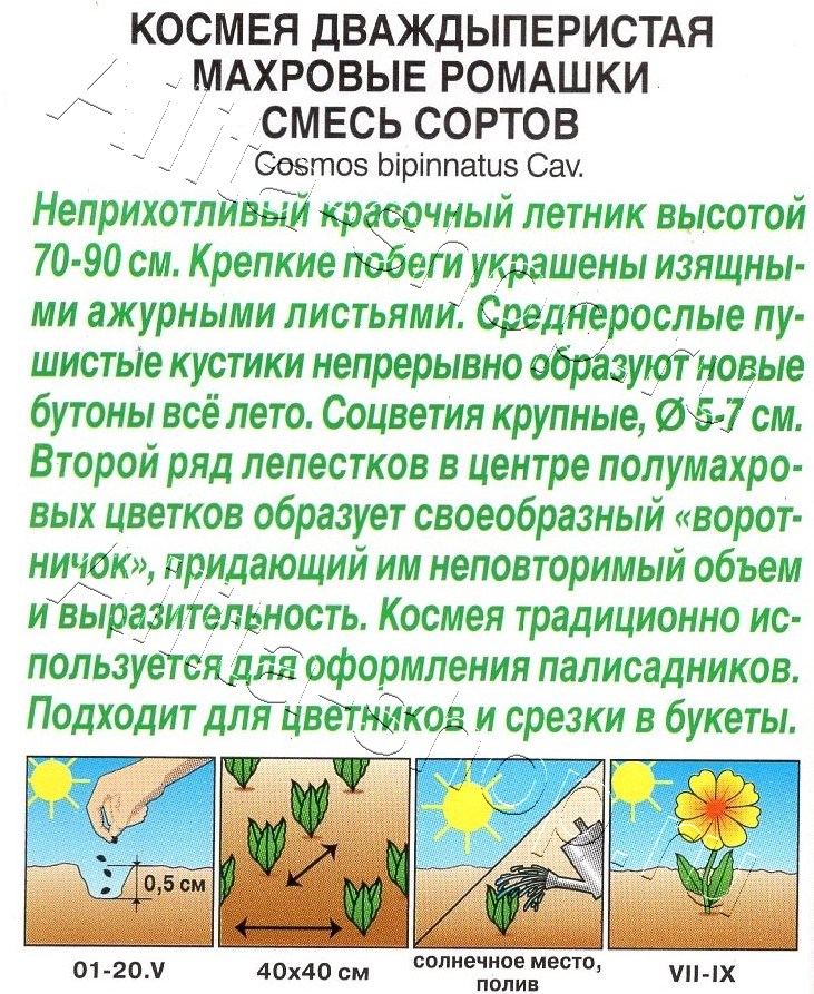 Неприхотливый красочный летник высотой 70-90 см. Крепкие побеги украшены изящными ажурными листьями. Среднерослые пушистые кустики непрерывно образуют новые бутоны всё лето. Соцветия крупные 5-7 см. Второй ряд лепестков в центре полумахровых цветков образует своеобразный «воротничок», придающий им неповторимый объем и выразительность. Космея традиционно используется для оформления палисадников. Подходит для цветников и срезки в букеты.Посевы размещают на дренированных почвах среднего плодородия. Семена фоточувствительны – лучше прорастают на свету. Сеют их поверхностно, слегка вдавливая в почву, гнездами по 3-4 шт. При температуре +15...+18°С всходы появляются через 1-2 недели.