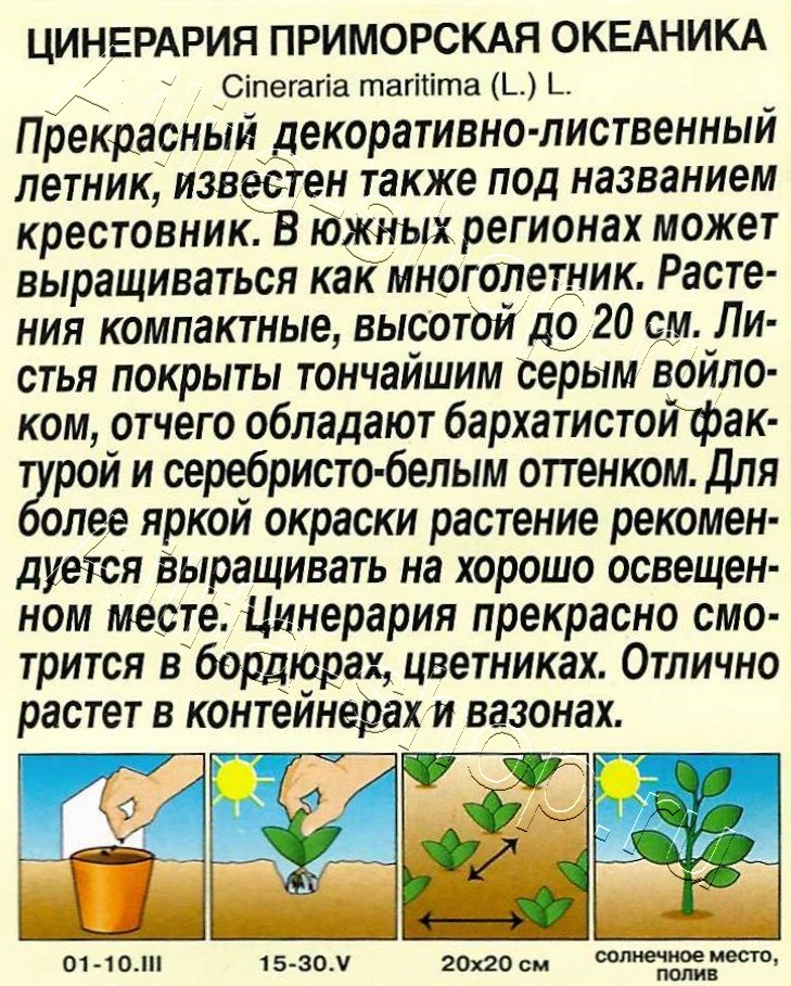 Прекрасный декоративно-лиственный летник, известен также под названием крестовник. В южных регионах может выращиваться как многолетник. Растения компактные, высотой до 20 см. Листья покрыты тончайшим серым войлоком, отчего обладают бархатистой фактурой и серебристо-белым оттенком. Для более яркой окраски растение рекомендуется выращивать на хорошо освещенном месте. Цинерария прекрасно смотрится в бордюрах, цветниках. Отлично растет в контейнерах и вазонах.Посев поверхностный, под стекло. Сеянцы пикируют в фазе 1-2 настоящих листочков. Цинерария светолюбива, холодостойка, засухоустойчива. Требует нейтральных по кислотности, дренированных почв среднего плодородия.