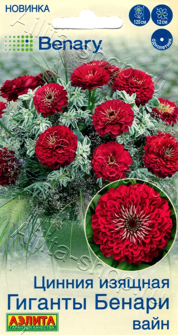 ООО «Агрофирма АЭЛИТА» — официальный дистрибьютор компании Benary.Истинный шедевр селекции! Серия, знаменитая во всем мире и ставшая классикой в цветоводстве. Она представлена роскошными срезочными цинниями с феноменально крупными цветками диаметром до 10-12 см. Растения высокорослые (около 1-1,2 м), с длинными и прочными цветоносными побегами. Соцветия махровые, пышные, потрясающих ярких окрасок. Букеты из этих цинний выглядят шикарно, надолго сохраняют свежесть в вазе с водой. В цветниках сорт удивит неприхотливостью и эталонной декоративностью. Растениям следует обеспечить солнечное местоположение, опору и защиту от ветра, особенно в одиночных посадках.