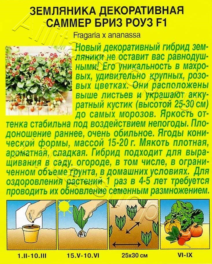 Новый декоративный гибрид земляники не оставит вас равнодушными! Его уникальность в махровых, удивительно крупных, розовых цветках. Они расположены выше листьев и украшают аккуратный кустик (высотой 25-30 см) до самых морозов. Яркость оттенка стабильна под воздействием непогоды. Плодоношение раннее, очень обильное. Ягоды конической формы, массой 15-20 г. Мякоть плотная, ароматная, сладкая. Гибрид подходит для выращивания в саду, огороде, в том числе, в ограниченном объеме грунта, в домашних условиях. Для оздоровления растений 1 раз в 4-5 лет требуется проводить их обновление семенным размножением.