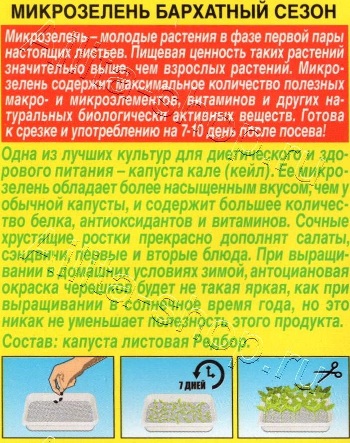 Микрозелень – это молодые растения в фазе первой пары настоящих листьев. Пищевая ценность таких растений значительно выше, чем взрослых растений. Микрозелень содержит максимальное количество полезных макро- и микроэлементов, витаминов и других натуральных биологически активных веществ. Готова к срезке и употреблению на 7-10 день после посева!Одна из лучших культур для диетического и здорового питания – капуста кале (кейл). Ее микрозелень обладает более насыщенным вкусом, чем у обычной капусты, и содержит большее количество белка, антиоксидантов и витаминов. Сочные хрус тящие ростки прекрасно дополнят салаты, сэндвичи, первые и вторые блюда. При выращивании в домашних условиях зимой, антоциановая окраска черешков будет не такая яркая, как при выращивании в солнечное время года, но это никак не уменьшает полезность этого продукта. Состав: капуста листовая Редбор.