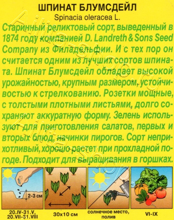 Старинный реликтовый сорт, выведенный в 1874 году компанией D. Landreth & Sons Seed Company из Филадельфии. И с тех пор он считается одним из лучших сортов шпината. Шпинат Блумсдейл обладает высокой урожайностью, крупным размером, устойчивостью к стрелкованию. Розетки мощные, с толстыми плотными листьями, долго сохраняют аккуратную форму. Зелень используют для приготовления салатов, первых и вторых блюд, начинки пирогов. Сорт неприхотливый, хорошо растет при прохладной погоде. Подходит для выращивания в горшках.