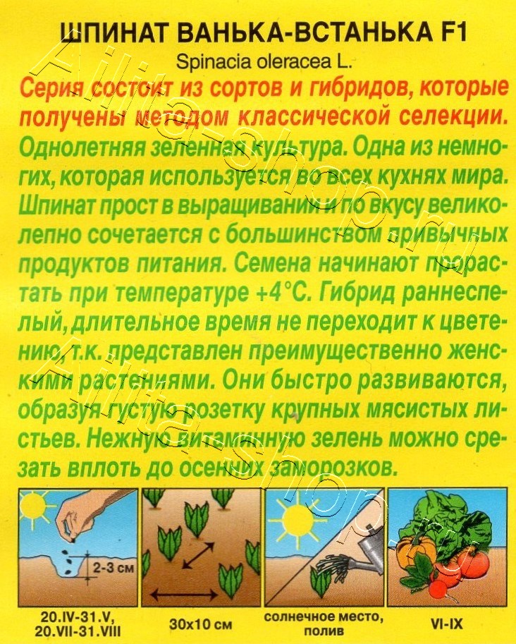 Серия состоит из сортов и гибридов, которые получены методом классической селекции.Однолетняя зеленная культура. Одна из немногих, которая используется во всех кухнях мира. Шпинат прост в выращивании и по вкусу великолепно сочетается с большинством привычных продуктов питания. Семена начинают прорастать при температуре +4 °С. Гибрид раннеспелый, длительное время не переходит к цветению, т.к. представлен преимущественно женскими растениями. Они быстро развиваются, образуя густую розетку крупных мясистых листьев. Нежную витаминную зелень можно срезать вплоть до осенних заморозков.
